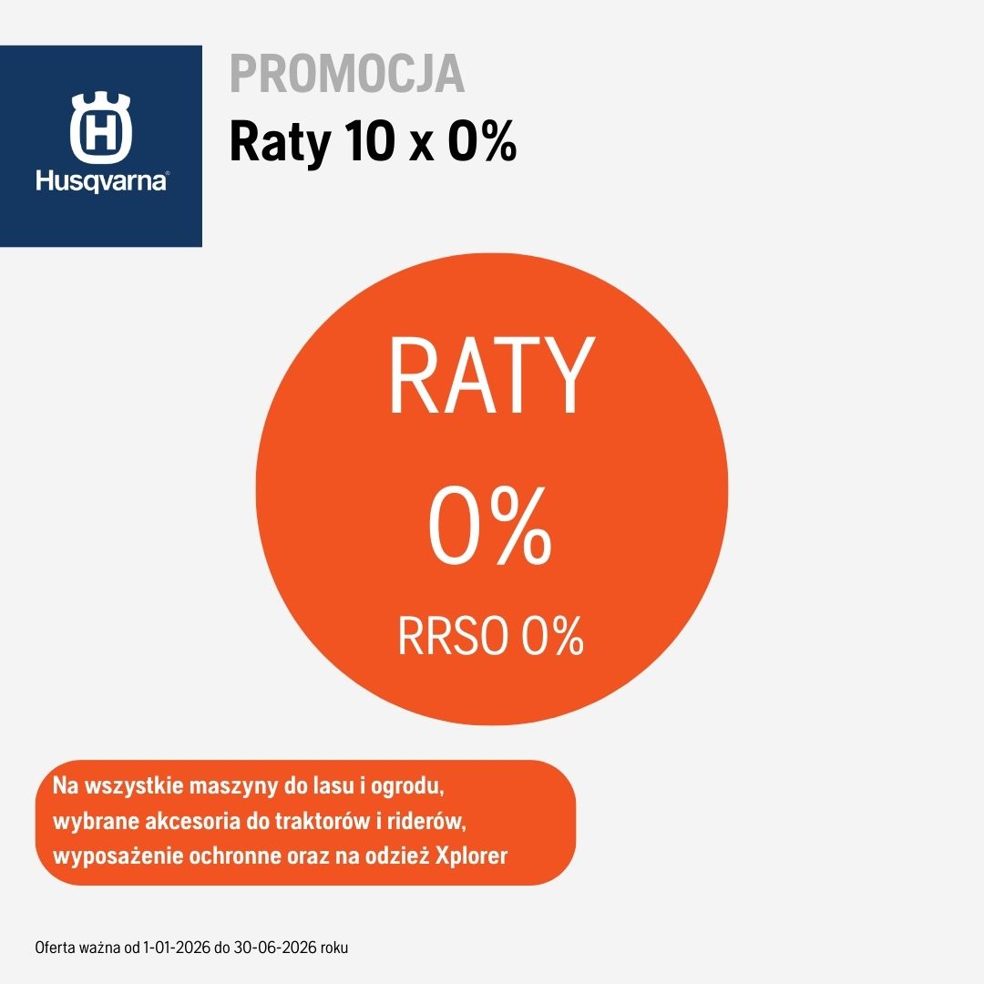 Zapraszamy do skorzystania z oferty zakupu w kredycie 10 RAT 0% na wszystkie maszyny do lasu i ogrodu Husqvarna, wybrane akcesoria do Riderów i traktorów, wyposażenie ochronne oraz serię outdoorową Xplorer.