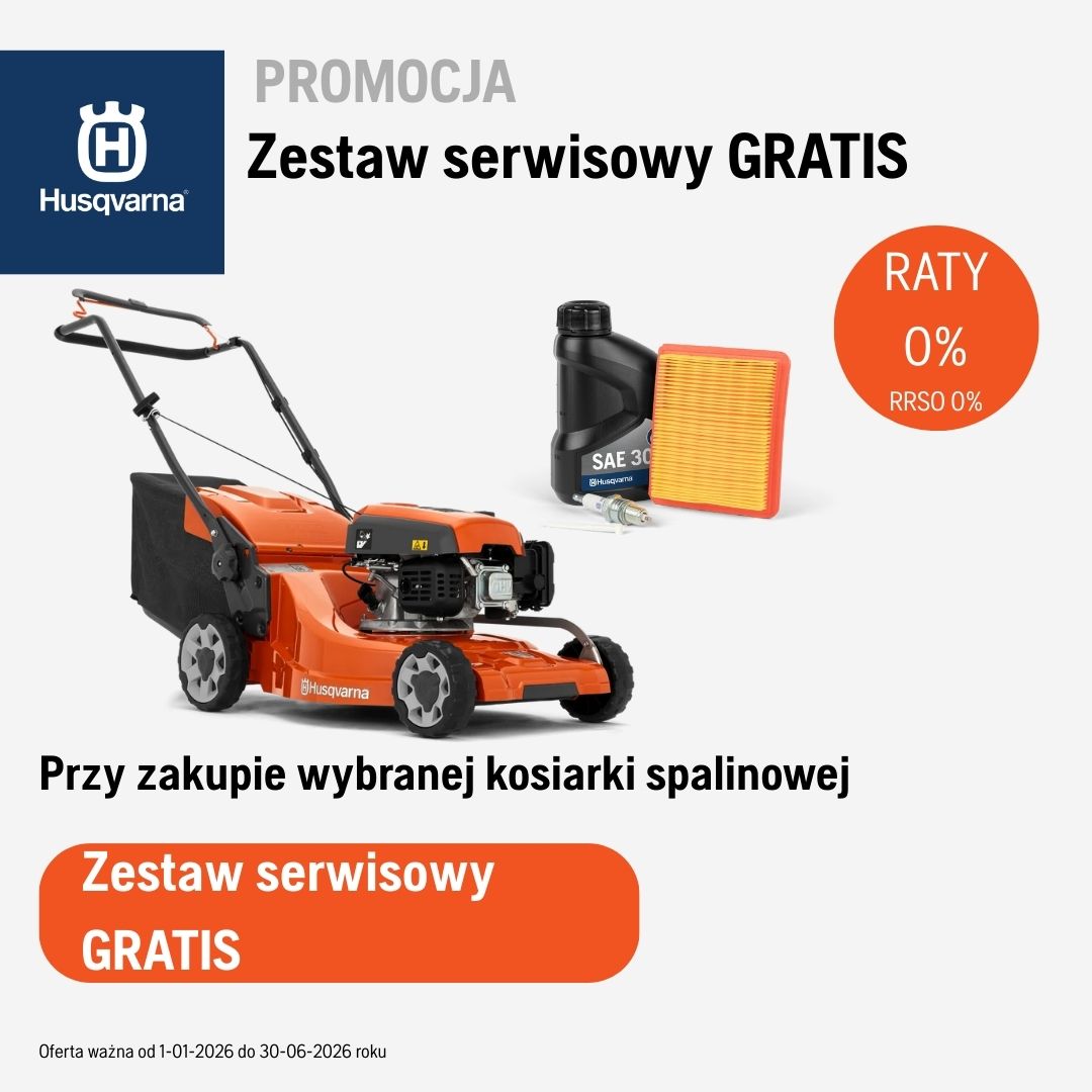 Teraz przy zakupie wybranych kosiarek Husqvarna otrzymasz dodatkowo zestaw serwisowy aby móc szybko i łatwo zadbać o swoją kosiarkę. Oferta ważna do 30.06.2026 roku lub wyczerpania zapasów.